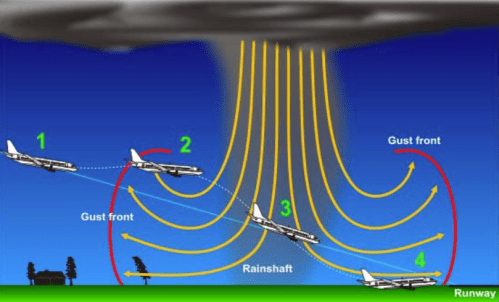 Extreme downdrafts, called downbursts or microbursts, can occur even without precipitation. Once these downdrafts hit the ground, they can spread out, sometimes for tens of miles, producing strong, shifting winds that can exceed 100 mph, and the dreaded wind shear.